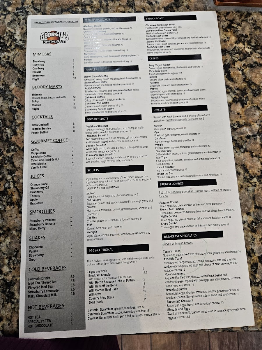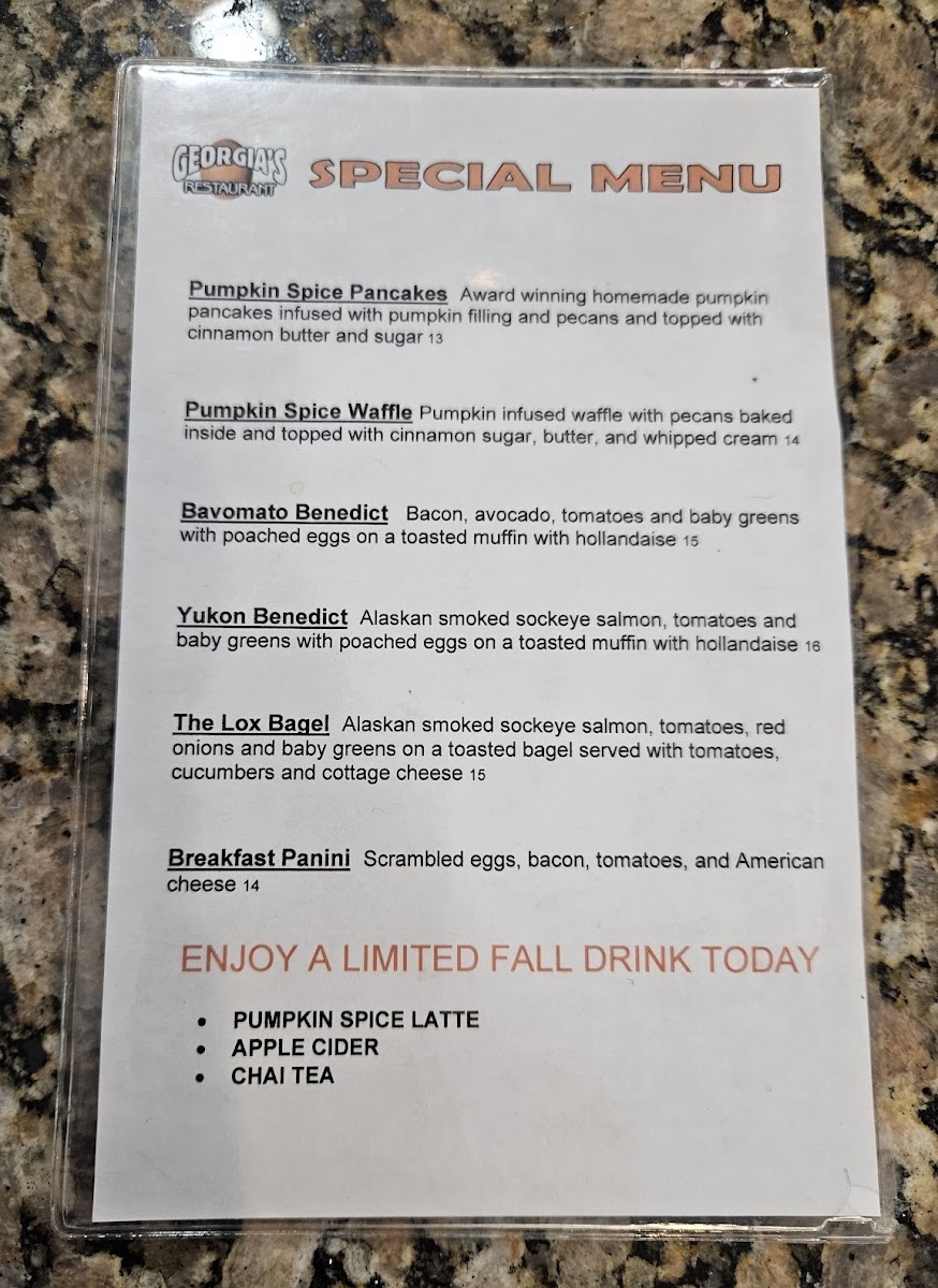 Customer favorites include the famous pumpkin spice waffles and the generous portions of the skillets, echoing the sentiment that every bite is a “real treat.” The warm atmosphere and attentive service elevate the experience, making Georgia's a must-visit.